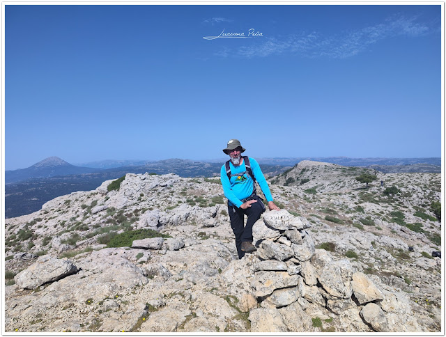 Llegamos a La Atalaya que con 2083 metros es el pico más alto de Albacete, desde allí además de ver el vértice al que después iremos y La Guillimona que habíamos hecho el día anterior, tenemos parte de las vistas de la Sierra de la Guillimona con el Puntal de la Misa, Yelmo y otros calares de la zona, además vemos La Sierra de Moratalla donde está el Pico más alto de Murcia, Sierra Espuña, como no La Sagra, Mariasnal o Los Puestos en Santiago de la Espada, desde esta cima que esta señalizada con un mojón de piedras al igual que la anterior, nos dirigimos hacia el vértice que vemos al fondo, llegamos a Las Cabras que tiene 3 metros menos que la Atalaya, desde aquí vemos casi lo mismo menos la parte de la Puebla de Don Fabrique y el Calderón que veíamos desde la Atalaya, nos asomamos un poco mas allá del vértice para ver una cresta y volvemos al vértice.
