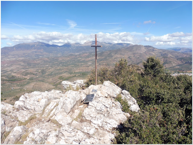 Allí en un cruce de camino bajaremos recto para después abandonar ese camino por un desvío a la derecha , cogemos otro camino en un desvío a la derecha y ese camino lo abandonaremos para ir un sendero definido que nos lleva a la cabecera del barranco del cortijo de los ciervos donde subiremos a buscar el vértice Cañadón de Gómez que esta algo escondido entre arbustos, aunque ofrece muy buenas vistas de Sierra Mágina y alrededores esta algo empañado por los arboles, después seguiremos a la izquierda bajando para después subir a la cuerda de la Sierra de las Cuevezuelas, una cuerda muy cómoda de andar donde nos va acercando a la Piedra Montesa a la que subimos, después bajaremos hasta un cortafuegos en mal estado que iremos bajando con cuidado ya que hay piedra suelta hasta llegar a un cruce de un camino que seguimos y que pronto abandonamos para buscar el sendero de la Sierra de las Cuevezuelas, al principio algo perdido y más adelante bastante bien definido, aunque con algún tramo en el que hay que sortear algún árbol caído o arbustos que lo han invadido, al fondo vemos la Piedra Ballesteros o la Cima del Cerro Frontil, en el sendero nos encontramos con la pasá del Lobo o Piedra Rodá, el sendero se va acercando a la pista, subimos hacia la derecha para acortar el camino al que salimos, subimos el camino donde vemos la cruz del cerro Frontil al que subimos.