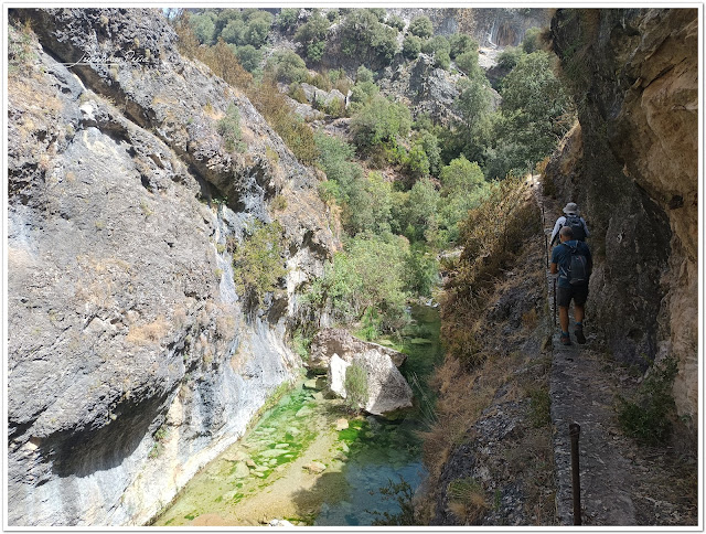 En el margen derecho nos encontramos con una puerta del vado de pesca que pasamos por al lado ya que no hay vallas, al lado hay una vieja caseta de control, hay que descolgarse con mucho cuidado para bajar a una cueva que nos lleva al arroyo, antes había una cuerda pero está cortada, una vez en el rio haciendo malabares por las rocas salvaremos una gran poza y llegamos al cruce donde de la Senda de los Pescadores, esta senda dividida en dos partes por un puente que se cayó, giramos a la derecha para ver el segundo tramo el más bonito y largo de los dos, para eso cruzamos el rio Guadalentín por lo que queda del puente buscando un sendero que sube al tranquillo que va a parar al cortijo de la Paulera, dejándolo a la derecha llegaremos al sendero y después a la primera pasarela donde hay que ir con cuidado ya que no tiene barandilla, a cada paso va sorprendiendo el entorno, hay que cruzar varias veces el rio por donde se va pudiendo para seguir esta senda después pasaremos otra pasarela donde hay una poza de mucha profundidad, siguiendo por el rio al llegar a un árbol seco cruzamos de nuevo y nos encontramos con una pequeña cueva manantial por donde cae el agua, mas adelante nos encontraremos con la cueva de los Orcos, así esta bautizada en algunas partes pero dudo de ese nombre, es una gran covacha, seguimos un poco mas por el rio y por lo que queda de la senda hasta llegar a una zona de grandes rocas donde seguir es bastante difícil y donde nos vamos a dar la vuelta hasta el cruce del Arroyo de los Tornillos del Gualay con el Rio Guadalentín.